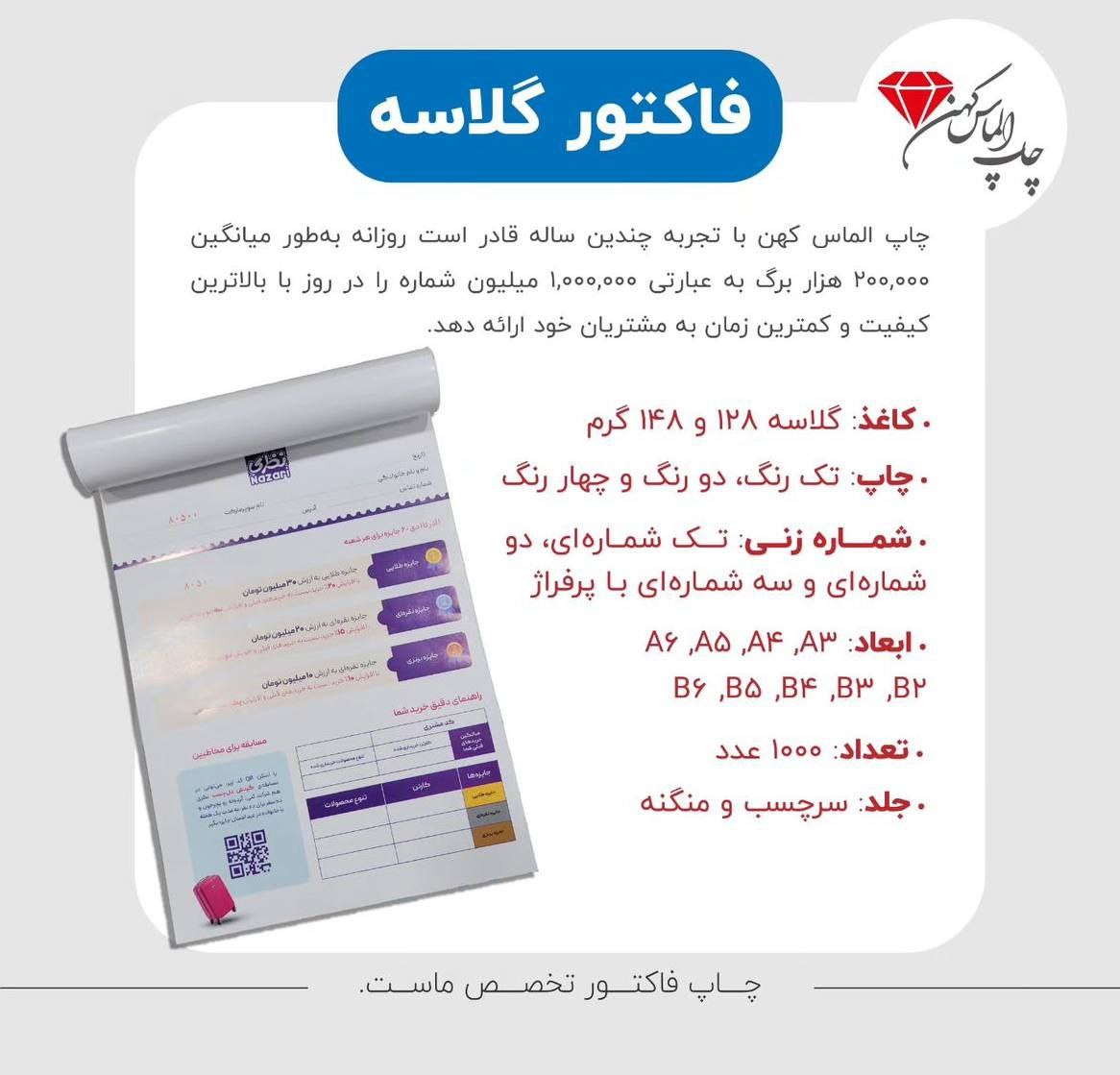 فاکتور سایز غیر دقیق A4: سایز این محصول 20 در 29 است و بعد از برش بین 1 الی 3 میلیمتر از آن کم می شود و در مواردی که می خواهید استفاده درون سازمانی داشته باشید و یا اینکه فاکتور A4 خود را داخل پرینتر نمی گذارید، می تواند انتخاب شما باشد.